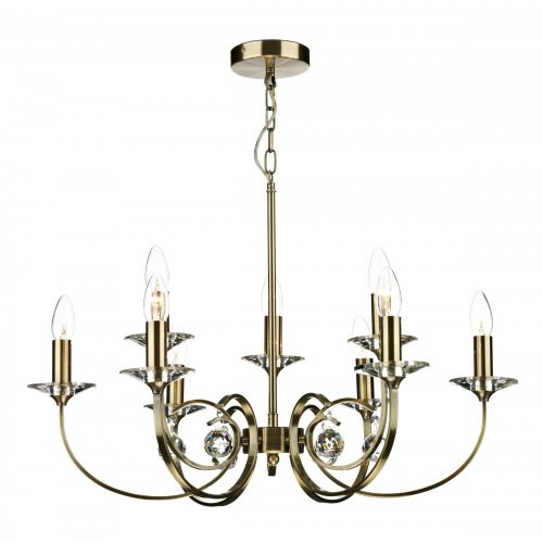 Description: ALL1375 Colour: Antique Brass Features: -Allegra range.-Available in polished chrome and antique brass colours.-Lamp holder type: Small Edison Screw. Specifications: -Accommodates: 9 x 40W CNDL bulbs (not included). Dimensions: -Dimensions: 150cm H x 70cm W x 70cm D.