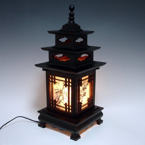 Description: This unique wood table lamp features a structure consisting of a three story pagoda and traditional Korean windows. When the light is on, each side reveals the design of Sagunja, or "four noble beings," containing four plants, maehwa (spring), orchid (summer), chrysanthemum (autumn) and bamboo (winter) that symbolize the four seasons. There is a pull string switch on the lamp so that the user can choose from two colors of light. This wood lamp radiates soft and comforting natural light to soothe the body and mind, tired from busy urban life.