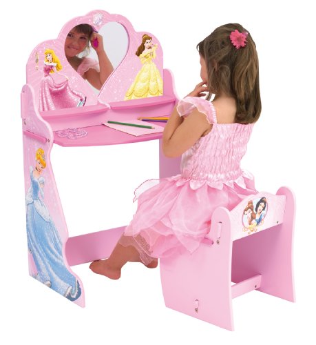 Description: Every little girl dreams of being a Princess! The Disney Princess Vanity Table with its mirror and matching stool gives little girls a place to bring that dream to life! It also doubles as a writing desk and has two useful storage places for pens, jewellery or hair accessories.