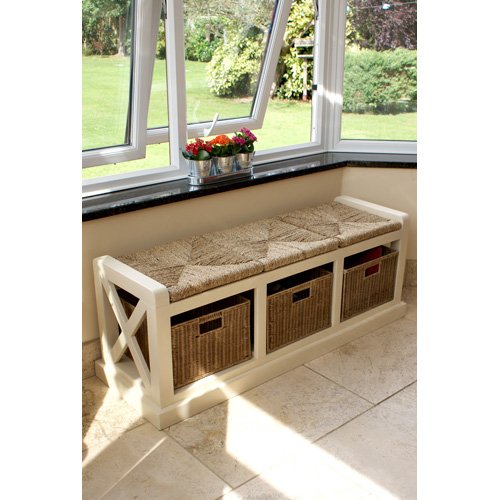 Description: This beautiful, hand crafted Hallway Bench is the ideal storage solution for busy homes. Featuring three wicker storage baskets with easy access handles to keep a tidy home. Perfect for storing winter gloves, scarves and hats or toys, books or shoes.